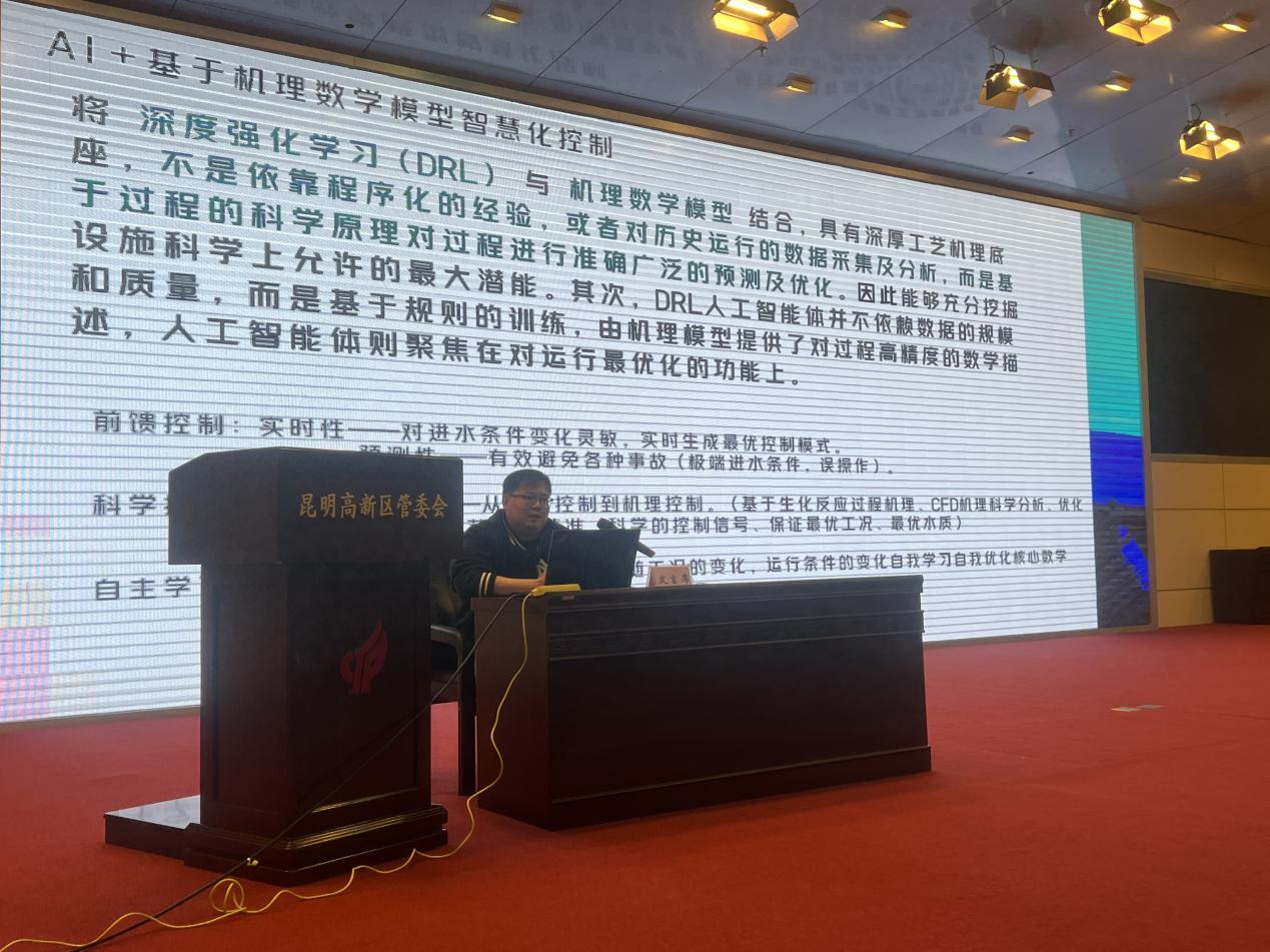 会议中,来自金科环境股份有限公司、绿易科技(广东)有限公司,厦门新能安科技股份有限公司、罗克佳华科技集团股份有限公司、上海交大博英联合研发中心、清华苏州环境创新研究院等诸多业内专家学者及企业代表,围绕虚拟电厂源网荷储运营、温室气体管控、光伏多元赋能、生物质清洁利用等核心技术,以及AI智慧水务、绿色保险、企业碳管理等创新举措作分享。我院施宇震老师受邀登台,就AI智慧水务相关技术应用、实践路径与在场嘉宾展开深入交流沟通,分享前沿技术成果,为园区水务绿色低碳升级提供专业思路,也为学院后续产学研融合提供了丰富实践参考。交流研讨环节,学院参会人员与昆明高新区各部门、贵金属集团、立讯科技、贝泰妮集团等园区企业代表,就零碳技术适配性、落地成本控制、后期运维保障等关键问题深入交流,精准对接企业需求,为后续校企合作、技术转化奠定坚实基础。