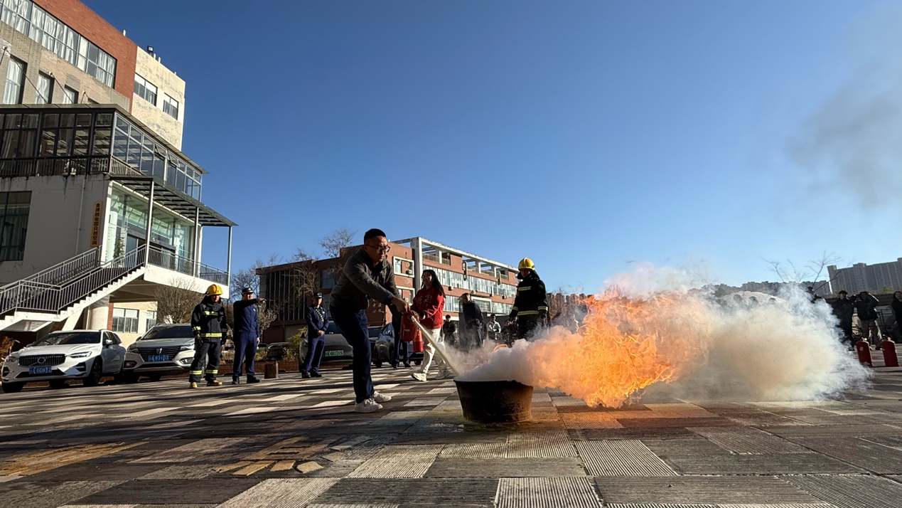 实操教学阶段,教官现场演示了灭火器、消火栓等常用消防器材的正确操作步骤,从器材检查、握持姿势到喷射角度,逐一拆解关键动作,并耐心解答师生疑问。在教官的指导下,师生们分组进行实操练习,亲手操作消防器材模拟灭火,切实掌握"提、拔、握、压"等核心技能,消除了对消防器材使用的陌生感与畏惧心理。