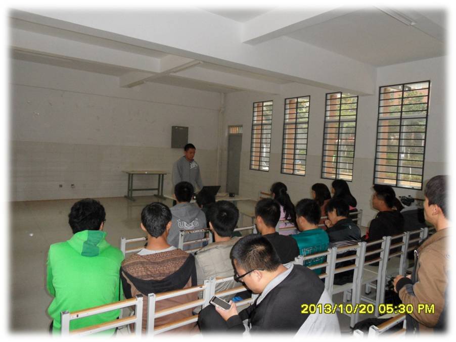 首先,团支书给大家普及了团员的基本知识,并强调了“坚持党的基本路线的政治意识;正确参与团内和社会管理监督的民主意识;团员权利与义务平等一致的意识;要学习法律知识,增强法制观念,自觉用社会主义道德和法律约束自己的行为,并学会以法律为武器,维护自己的正当权益和社会的安定团结;高于一般青年的模范意识。”几个观点。接下来,各宿舍分别演唱事先准备好的歌曲。最后,同学们合唱团歌并对之前演唱的歌曲进行了评比。活动结束后班委留下进行总结并将活动场地还原。