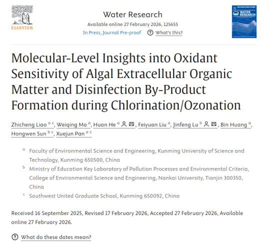 近日,昆明理工大学潘学军教授团队何欢教授和南开大学鲁金凤教授等人合作,在藻类胞外有机质氧化选择性及消毒副产物形成分子机制研究方面取得重要进展。相关工作在环境科学与水处理领域高水平学术期刊Water Research上发表了题为“Molecular-level insights into oxidant sensitivity of algal extracellular organic matter and disinfection by-product formation during chlorination/ozonation”的研究论文。
